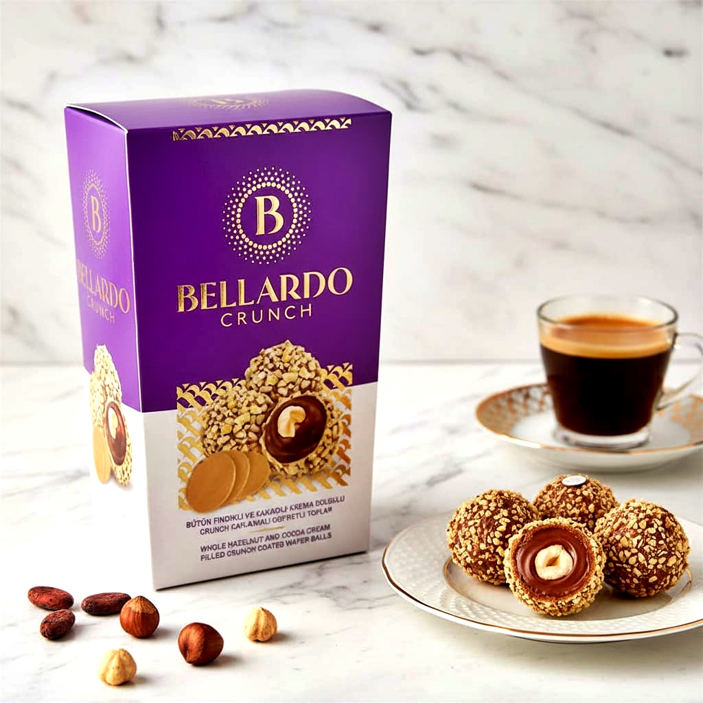 BELLARDO 3'LÜ PAKET 30 GR İÇİ BÜTÜN FINDIKLI DIŞI CRUNCH KAPLAMALI ÇİKOLATA DOLGULU TRÜF (ADET FİYATI 32 TL'DİR. KUTU İÇİ 16 ADETTİR) -- 199