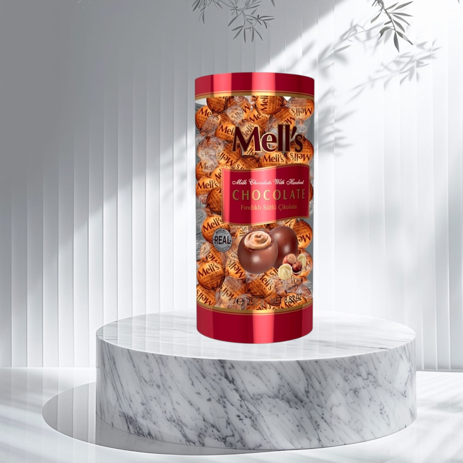 MELL'S CHOCOLATE SİLİNDİR KUTU 250 GR FINDIKLI SÜTLÜ (ADET FİYATIDIR. KOLİ İÇİ 24 ADETTİR)