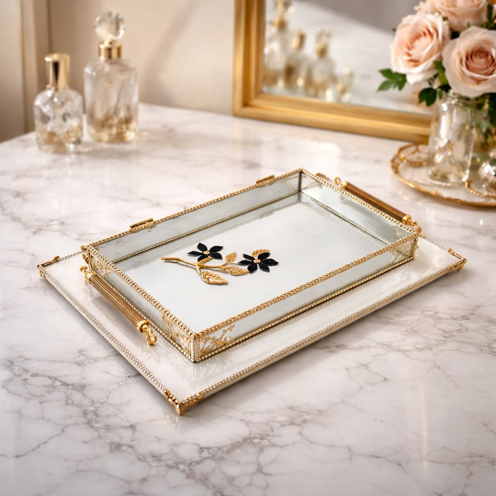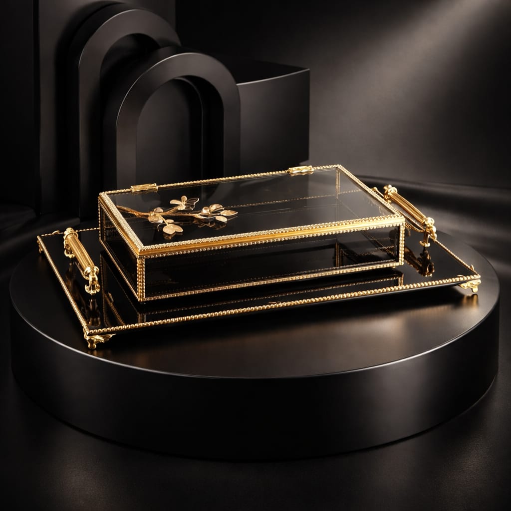 KDD SİYAH CAM, ZEYTİN DALI MİNE ÇALIŞMASI , DİKDÖRTGEN AYAKLI SUNUMLUK+CAM KUTU - 4095