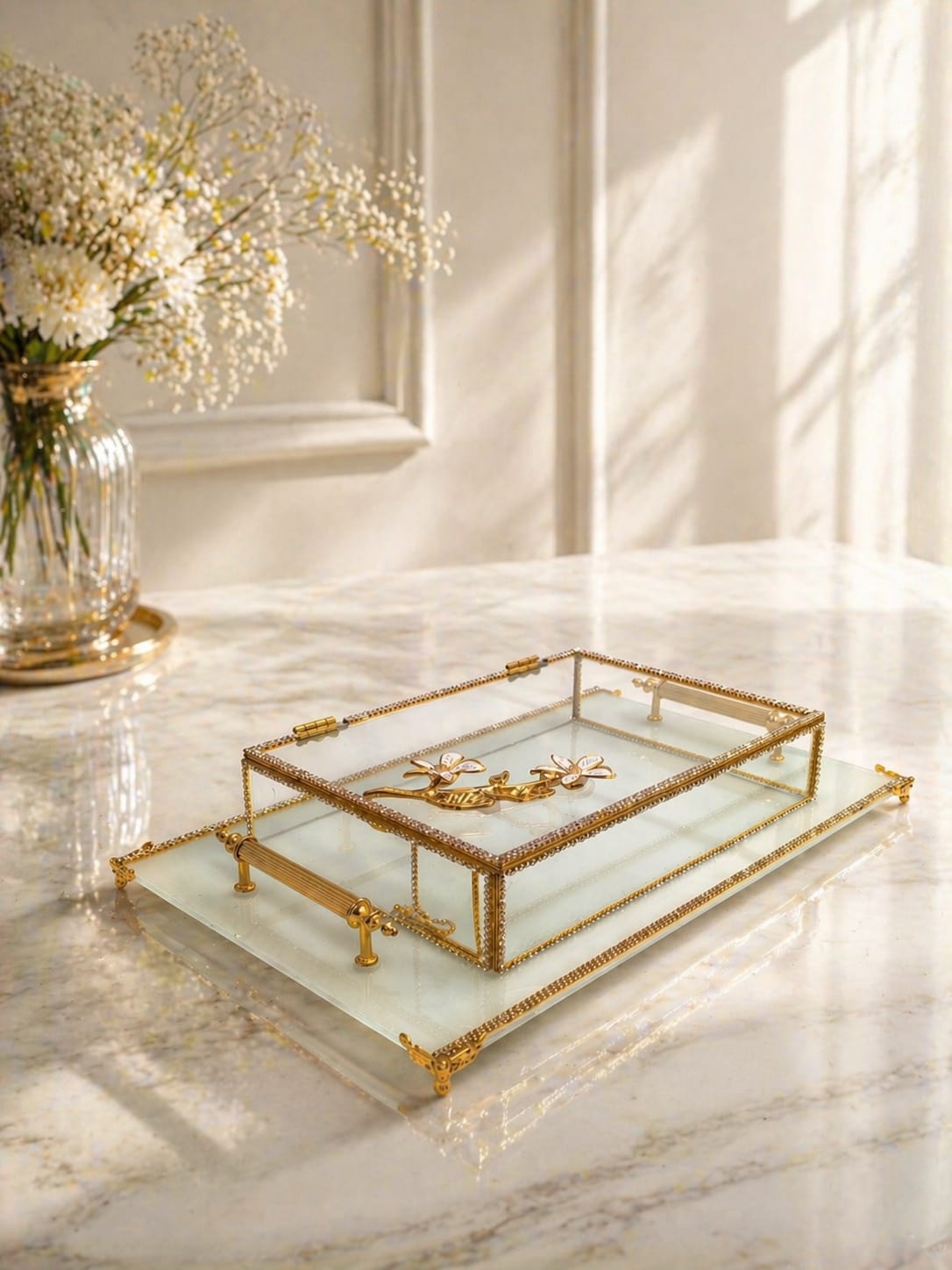 KDD BEYAZ CAM, MİNE ÇALIŞMASI , MAVİ KELEBEK , DİKDÖRTGEN AYAKLI SUNUMLUK+CAM KUTU - 4090