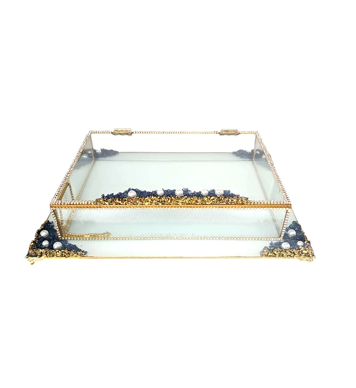 KDD BEYAZ CAM - İNCİLİ FÜME ALTIN TAŞLI SUNUMLUK + CAM KUTULU DİKDÖRTGEN JUMBO BOY AYAKLI SUNUMLUK -- 1321