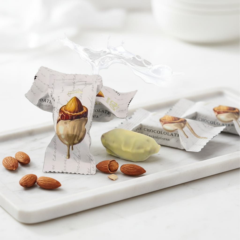 HURİES HURMA İÇİ BADEMLİ DIŞI FİLDİŞİ SÜTLÜ BEYAZ ÇİKOLATA KAPLI (KG FİYATI 780 TL'DİR. KOLİ İÇİ 10 KG'DİR)