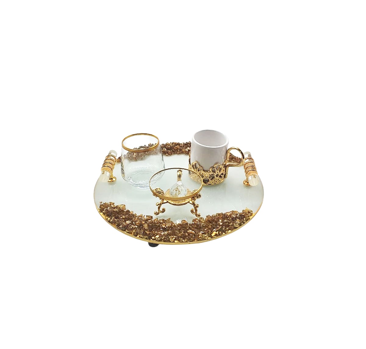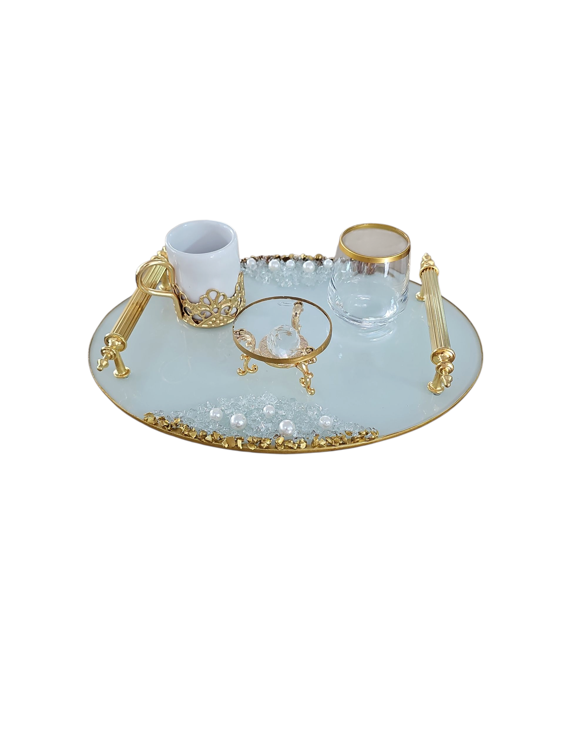 KDD BEYAZ CAM İNCİLİ-ALTIN TAŞLI DAMAT KAHVE SETİ KÜÇÜK BOY YUVARLAK- 3