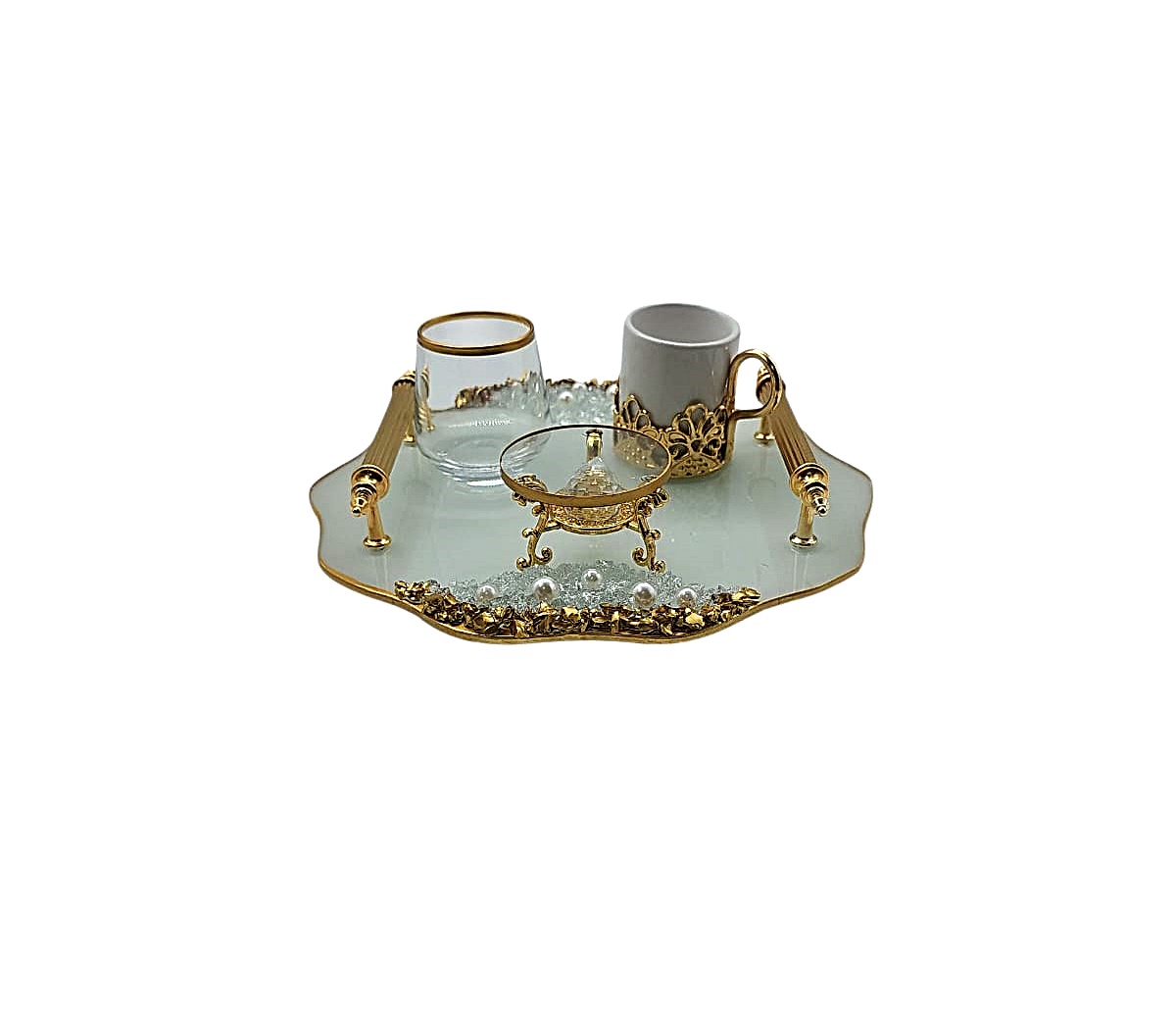 KDD BEYAZ CAM İNCİLİ -ALTIN TAŞLI DAMAT KAHVE SETİ KÜÇÜK BOY DALGALI YUVARLAK- 5