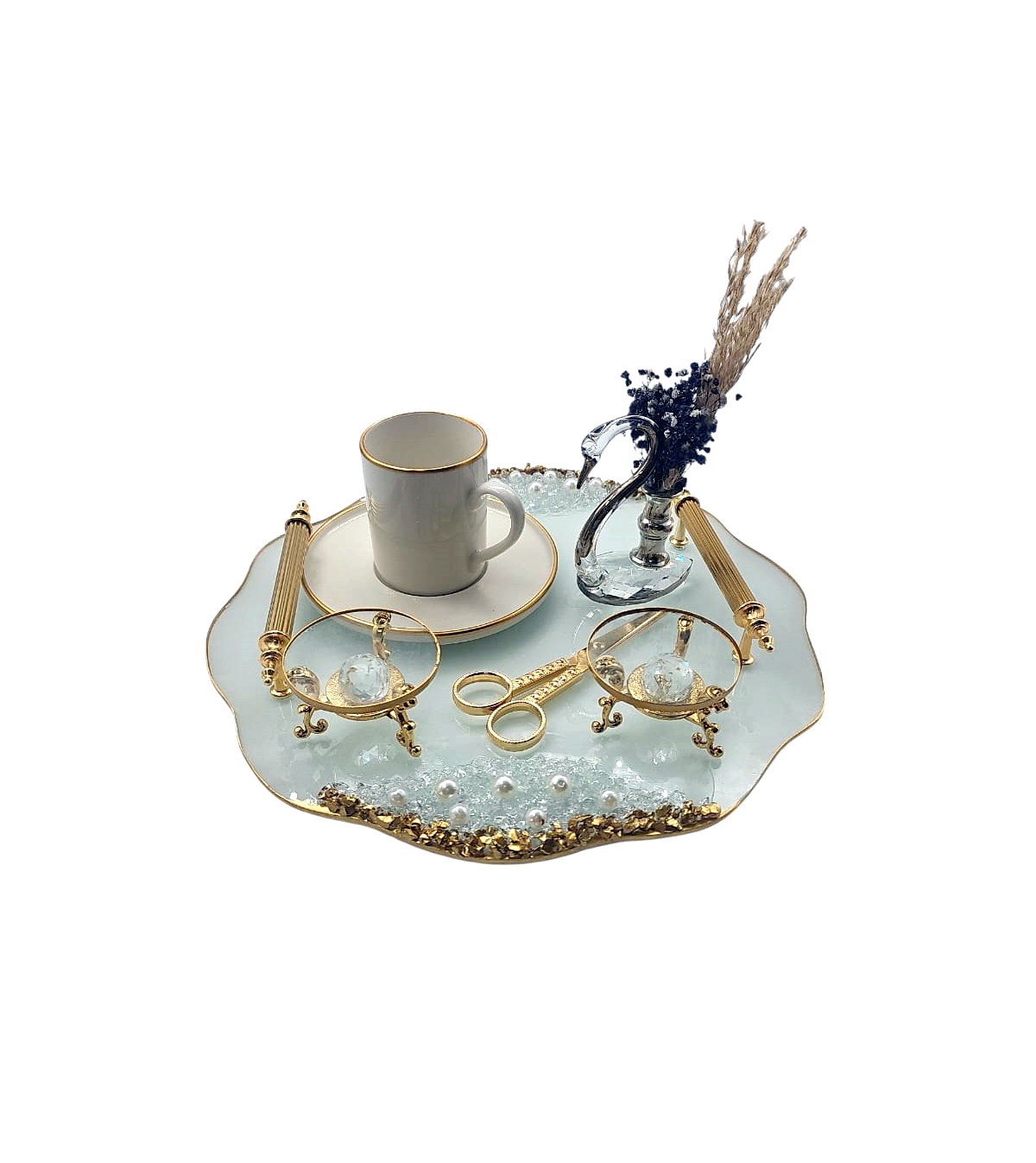KDD BEYAZ CAM -İNCİLİ ALTIN TAŞLI NİŞAN FULL SETİ BÜYÜK BOY YUVARLAK (KUĞU-FİNCAN-MAKAS-YÜZÜKLÜK) - 9
