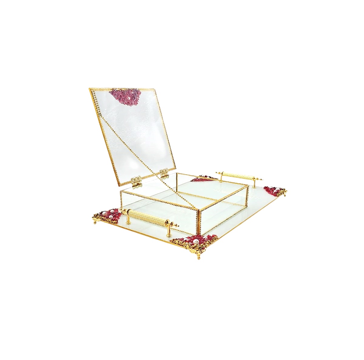 KDD BEYAZ CAM -İNCİLİ KIRMIZI /ALTIN TAŞLI TEPSİ+CAM KUTULU DİKDÖRTGEN JUMBO BOY AYAKLI SUNUMLUK-16