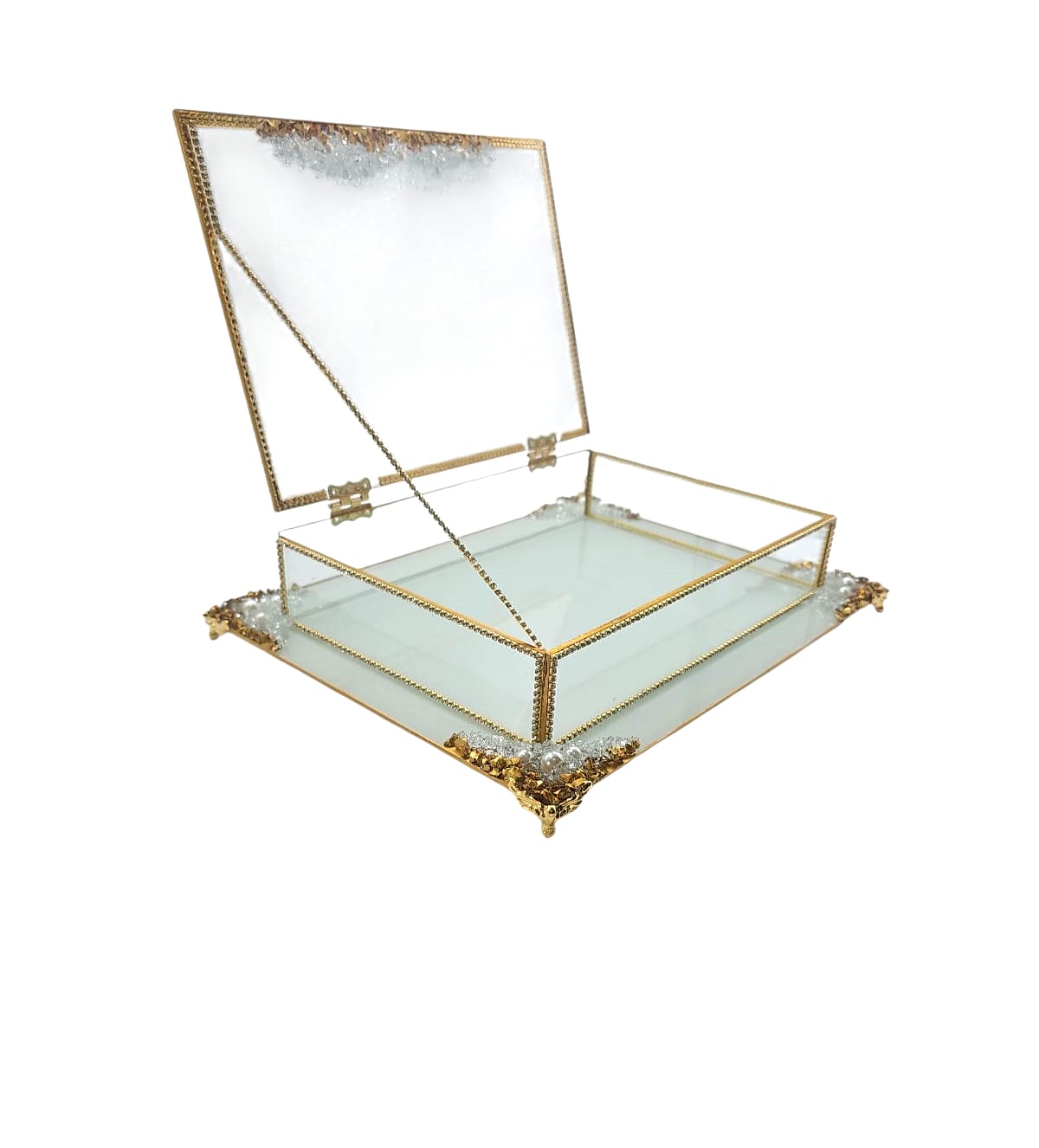 KDD BEYAZ CAM -İNCİLİ ALTIN TAŞLI SUNUMLUK+CAM KUTULU DİKDÖRTGEN JUMBO BOY AYAKLI SUNUMLUK-17