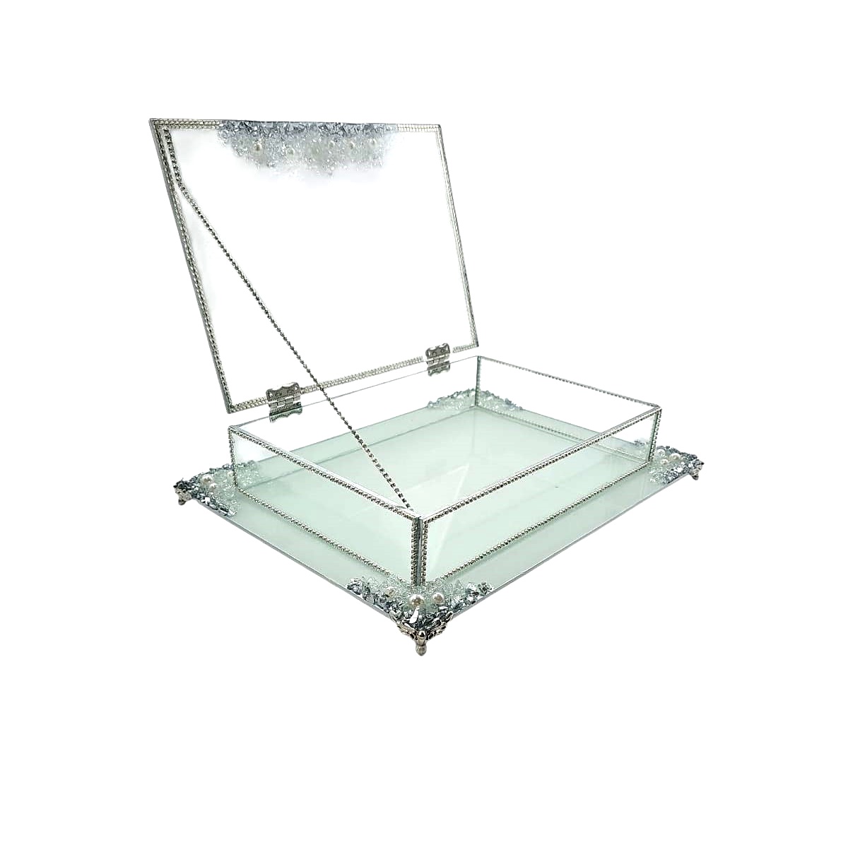 KDD BEYAZ CAM -İNCİLİ GÜMÜŞ TAŞLI SUNUMLUK+CAM KUTULU DİKDÖRTGEN JUMBO BOY AYAKLI SUNUMLUK-18