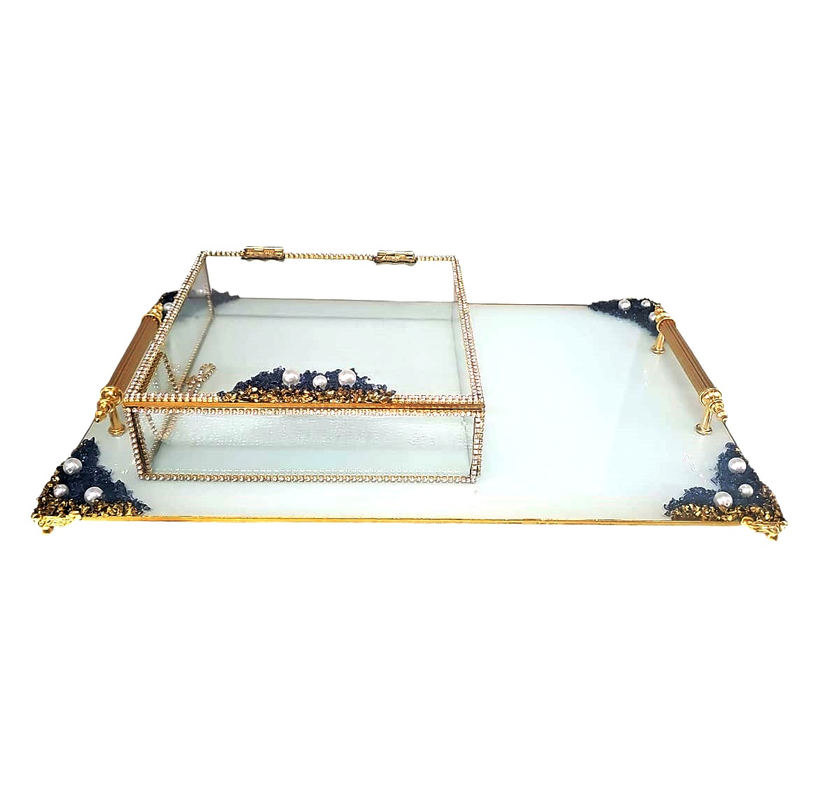 KDD BEYAZ CAM -İNCİLİ MAVİ /ALTIN TAŞLI TEPSİ+CAM KUTULU DİKDÖRTGEN JUMBO BOY AYAKLI SUNUMLUK-14