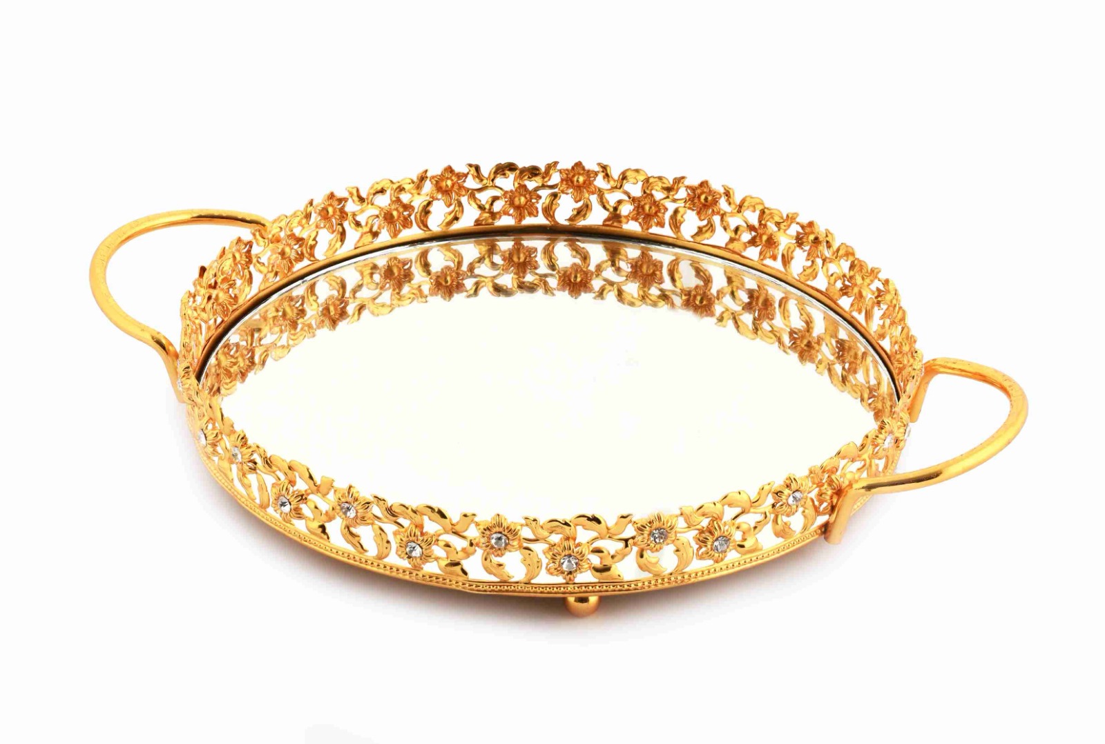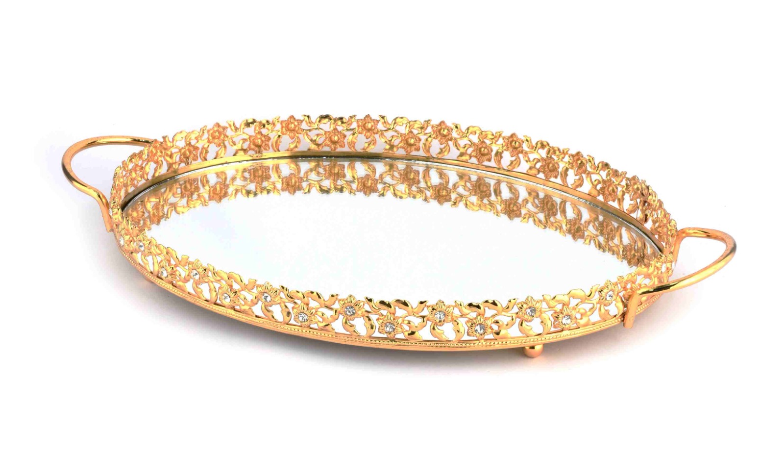 BKZ 4012-A LEYLAK PIRLANTA TAŞLI OVAL AYNALI TEPSİ 36,5x27x5 cm ALTIN
