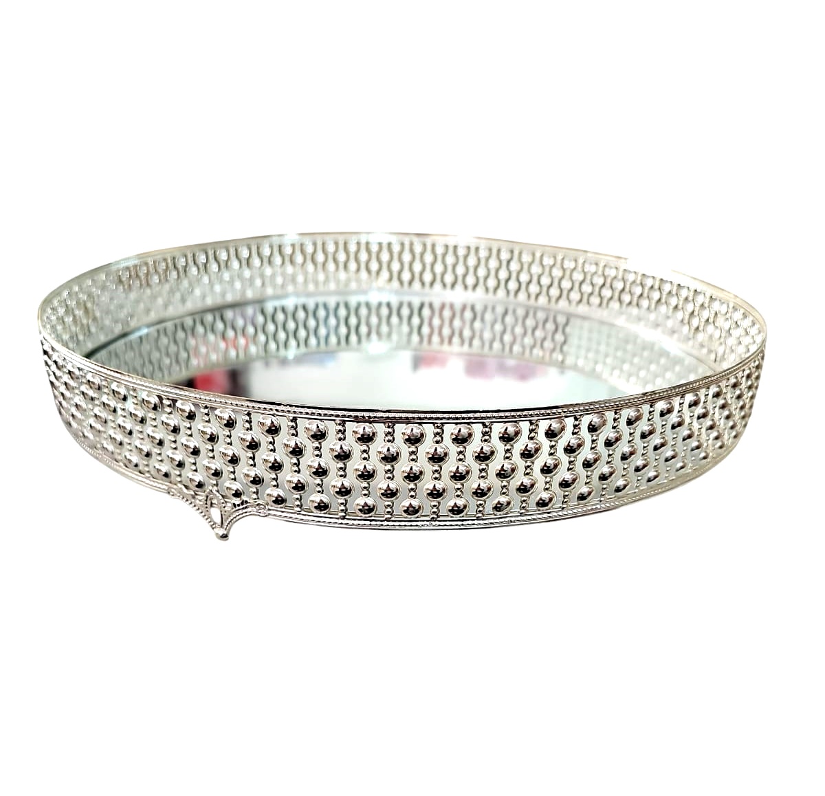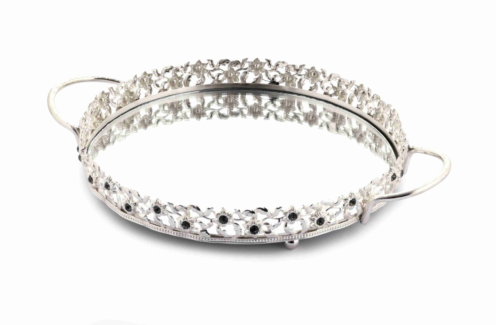 BKZ 4022-G LEYLAK PIRLANTA TAŞLI YUVARLAK AYNALI TEPSİ 36,5x27x5 cm GÜMÜŞ