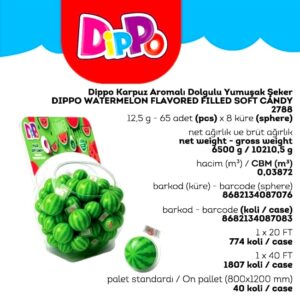 DİPPO DOLGULU YUMUŞAK ŞEKER KARPUZ (ADET FİYATI 9.5 TL’DİR. KÜRE İÇİ 65 ADETTİR.)