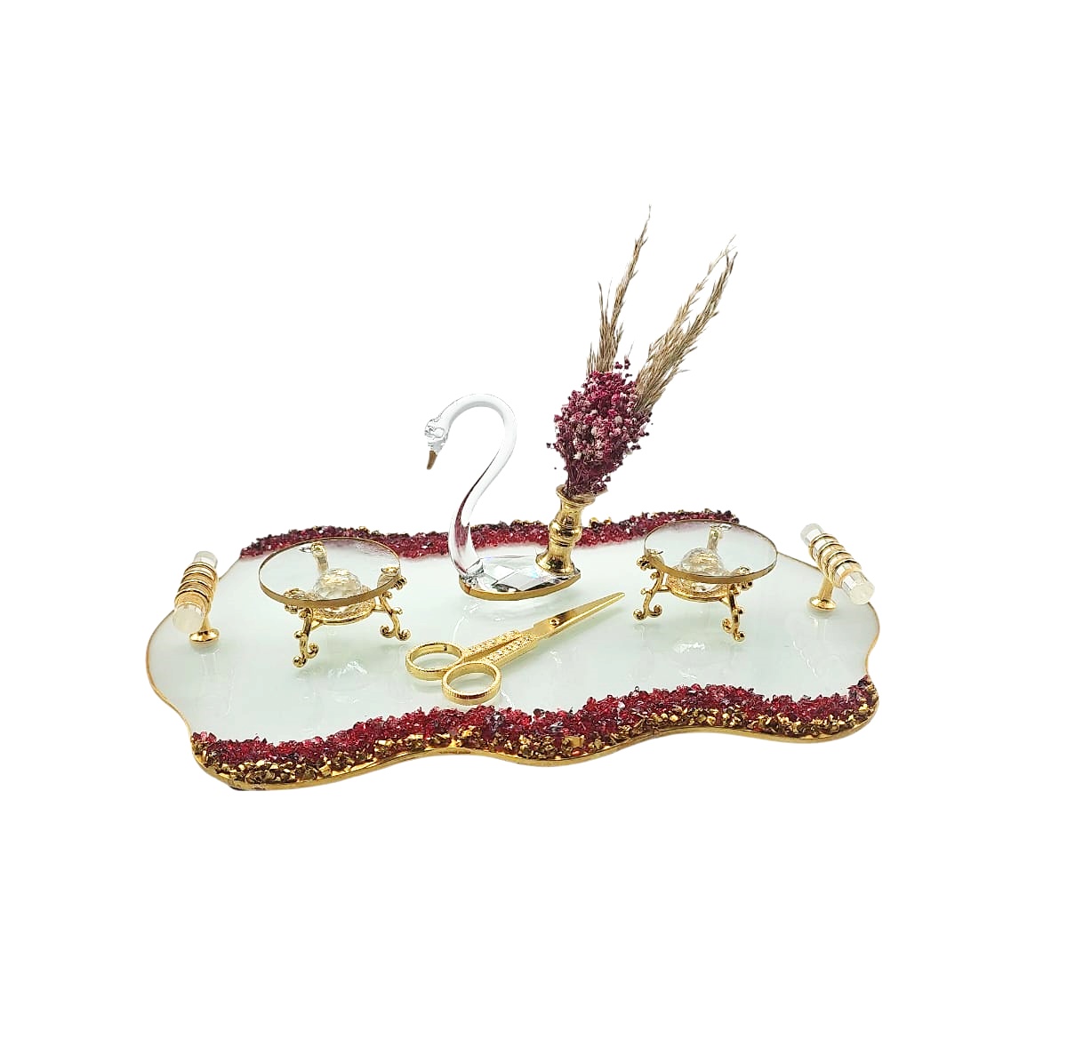 KDD BEYAZ CAM -ALTIN / KIRMIZI TAŞLI NİŞAN SETİ ORTA BOY DALGALI DİKDÖRTGEN (KUĞU-MAKAS-YÜZÜKLÜK) -11