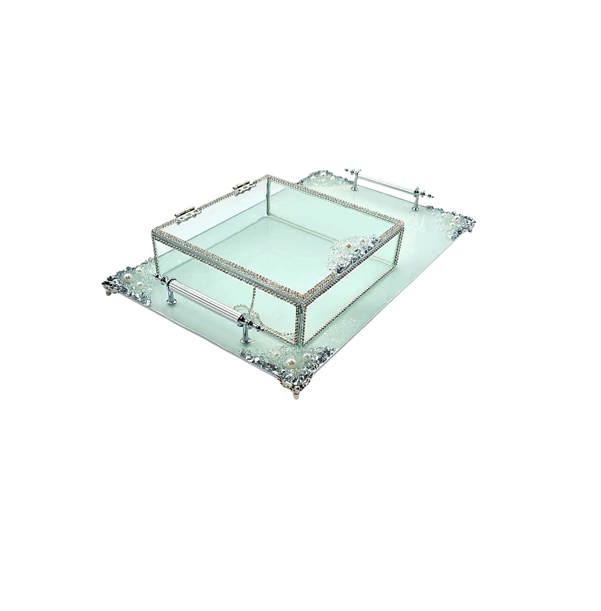 KDD BEYAZ CAM -İNCİLİ GÜMÜŞ TAŞLI TEPSİ+CAM KUTULU DİKDÖRTGEN JUMBO BOY AYAKLI SUNUMLUK-13