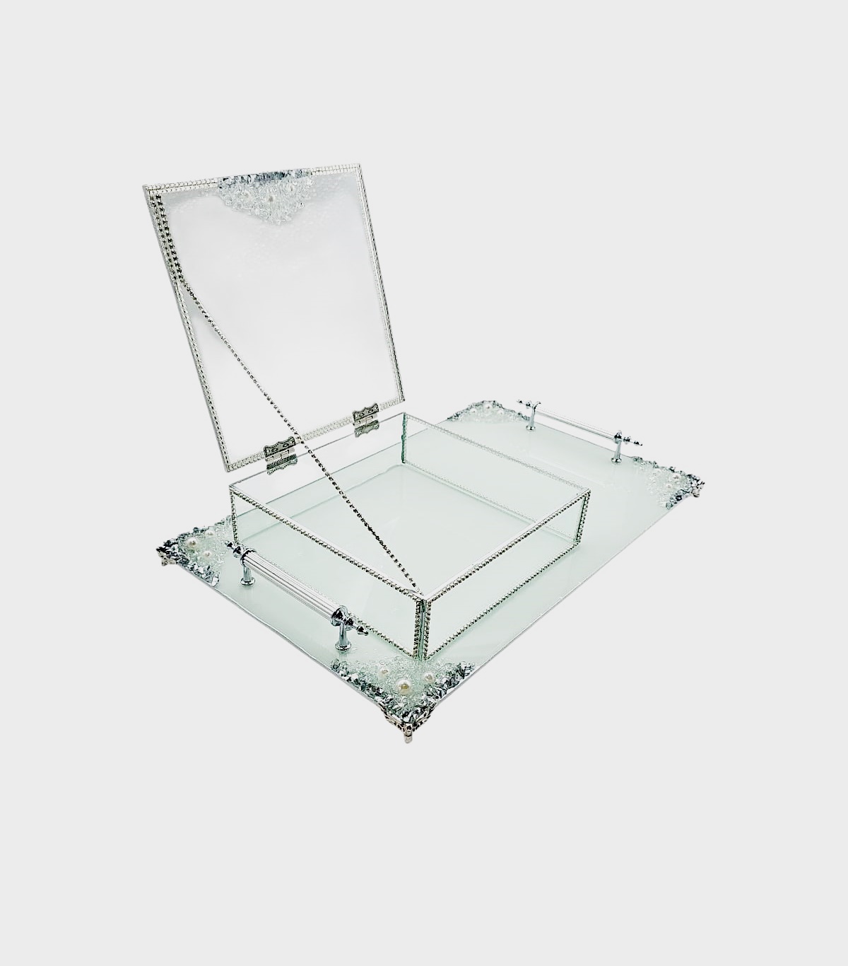 KDD BEYAZ CAM -İNCİLİ GÜMÜŞ TAŞLI TEPSİ+CAM KUTULU DİKDÖRTGEN JUMBO BOY AYAKLI SUNUMLUK-13