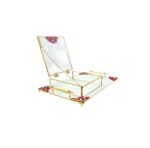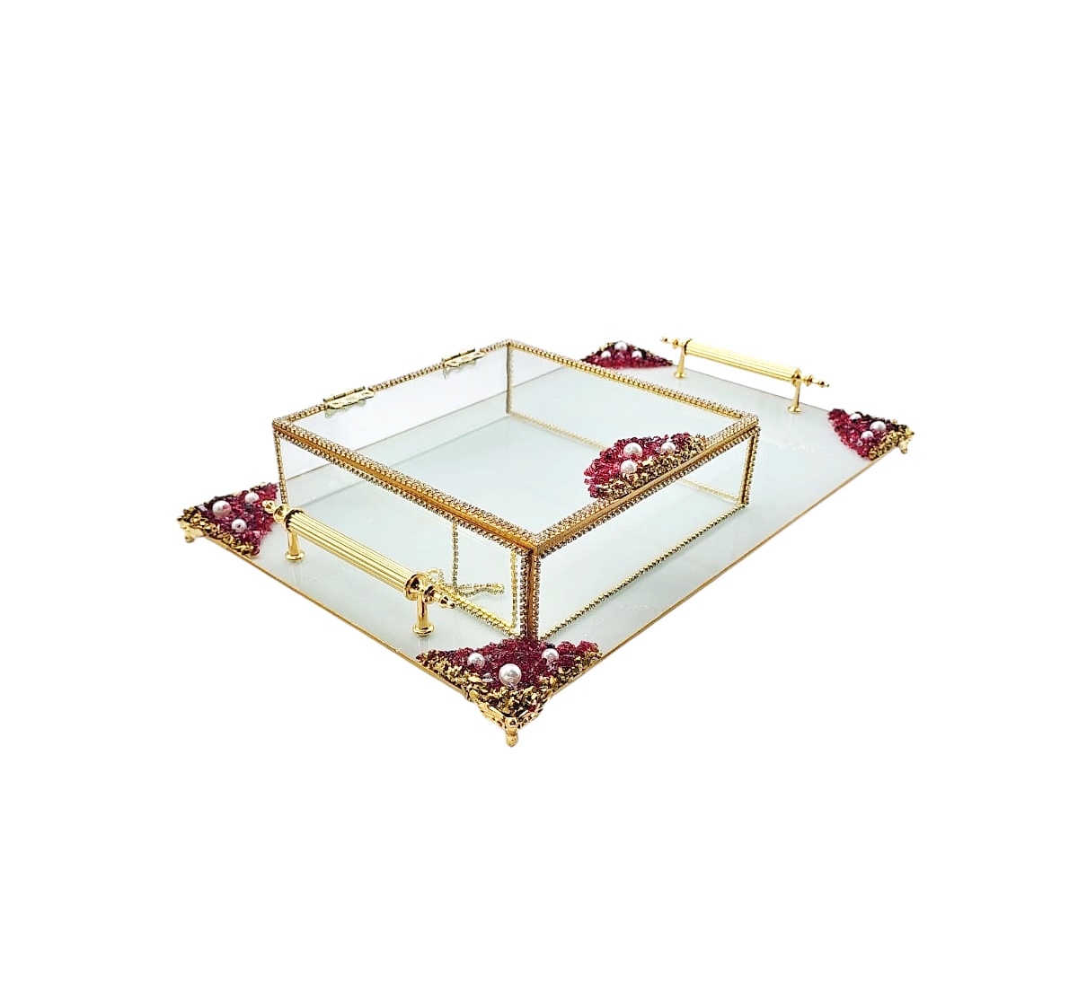 KDD BEYAZ CAM -İNCİLİ KIRMIZI /ALTIN TAŞLI TEPSİ+CAM KUTULU DİKDÖRTGEN JUMBO BOY AYAKLI SUNUMLUK-16