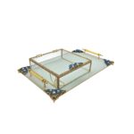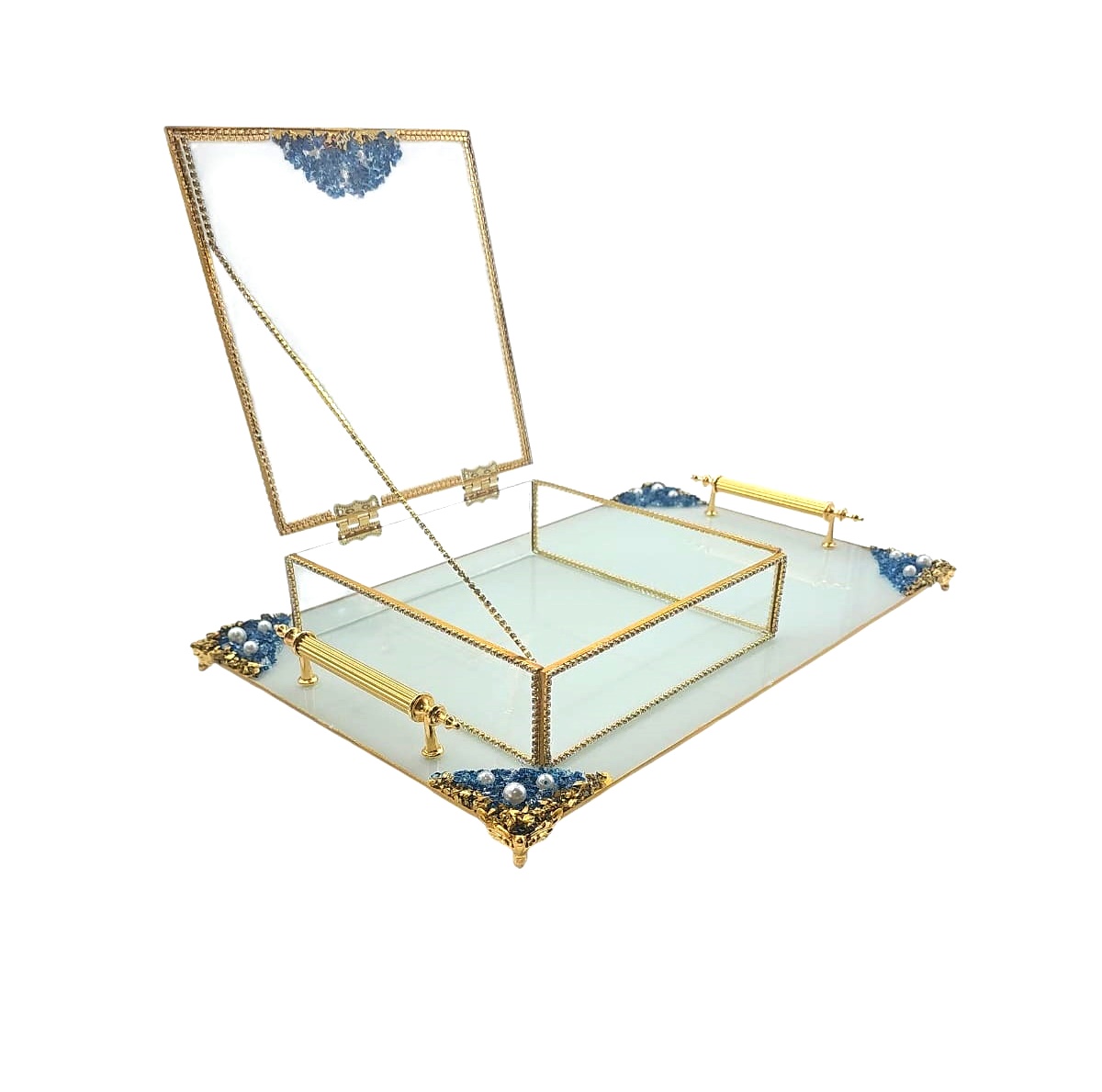 KDD BEYAZ CAM -İNCİLİ MAVİ /ALTIN TAŞLI TEPSİ+CAM KUTULU DİKDÖRTGEN JUMBO BOY AYAKLI SUNUMLUK-14