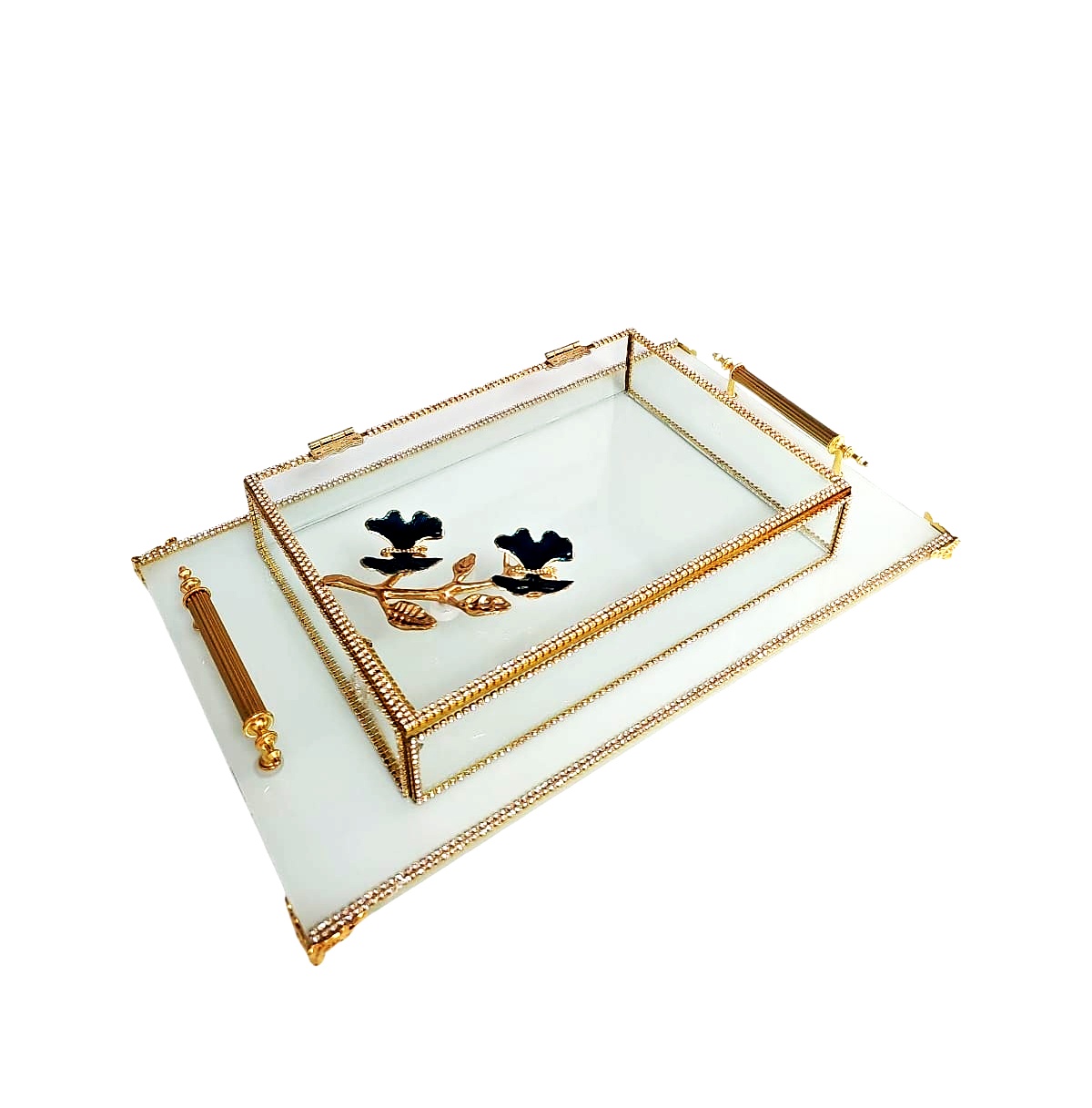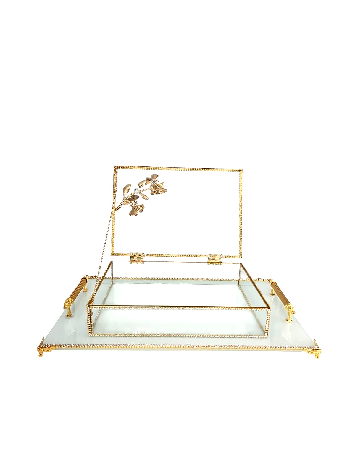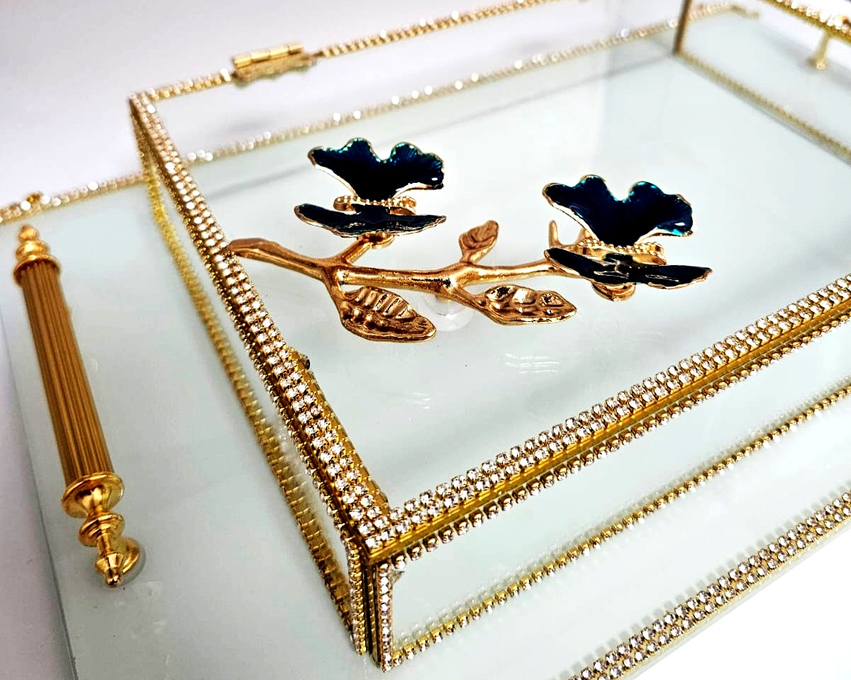 KDD BEYAZ CAM, MİNE ÇALIŞMASI , OKYANUS YEŞİLİ / MAVİSİ KELEBEK , DİKDÖRTGEN AYAKLI SUNUMLUK+CAM KUTU – 404