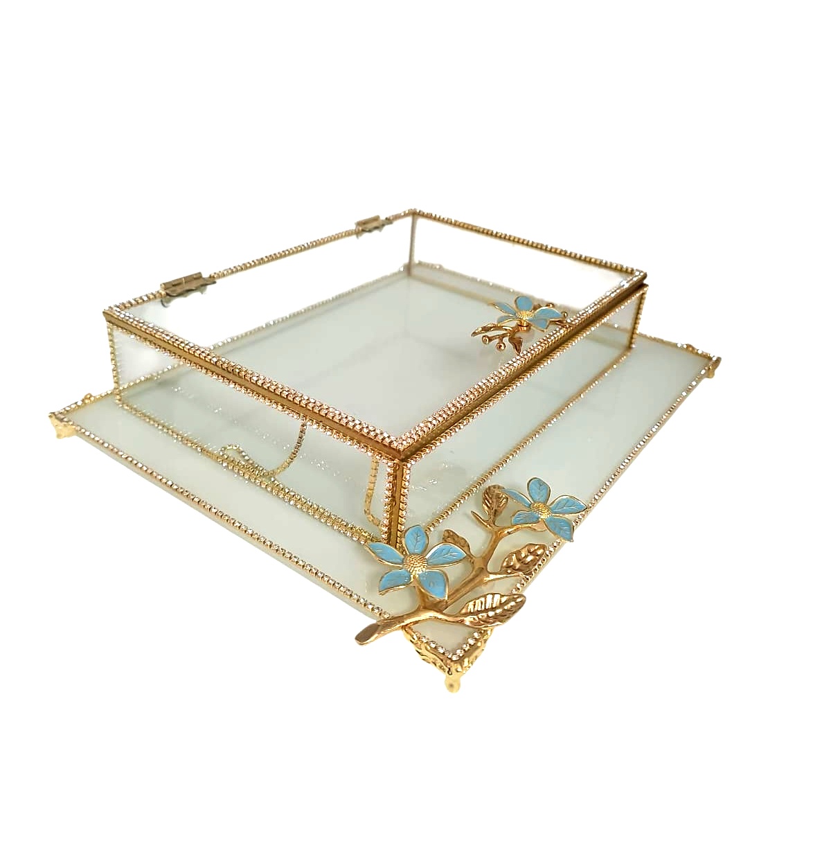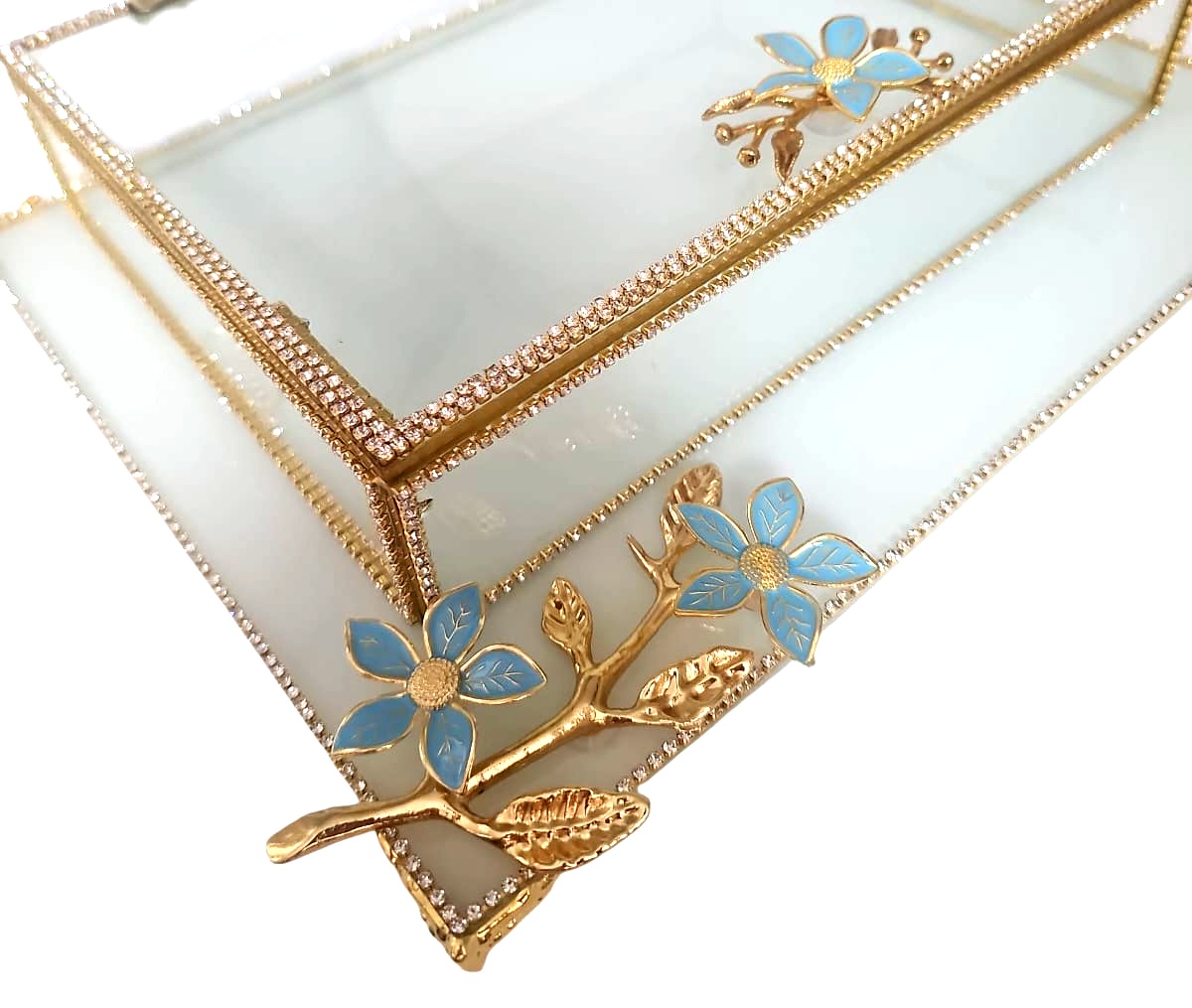 KDD BEYAZ CAM, MİNE ÇALIŞMASI , TURKUAZ PAPATYA , DİKDÖRTGEN AYAKLI SUNUMLUK+CAM KUTU – 4094