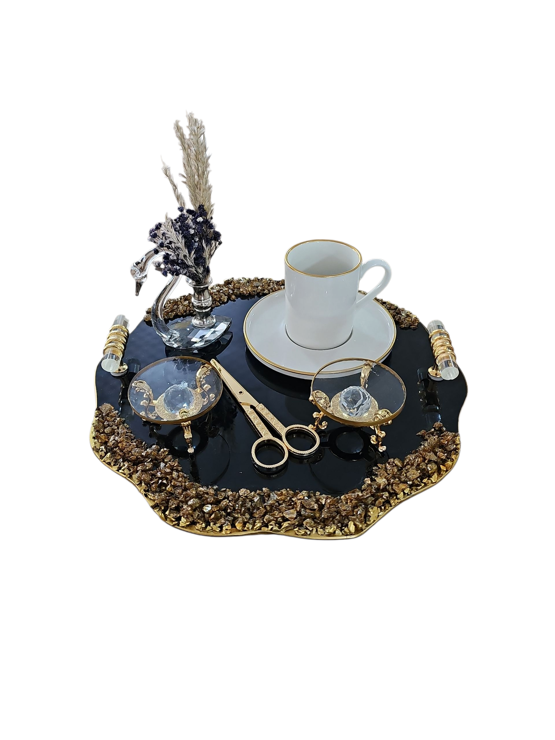 KDD SİYAH CAM -ALTIN TAŞLI NİŞAN SETİ ORTA BOY DALGALI YUVARLAK (KUĞU-FİNCAN-MAKAS-YÜZÜKLÜK) – 10