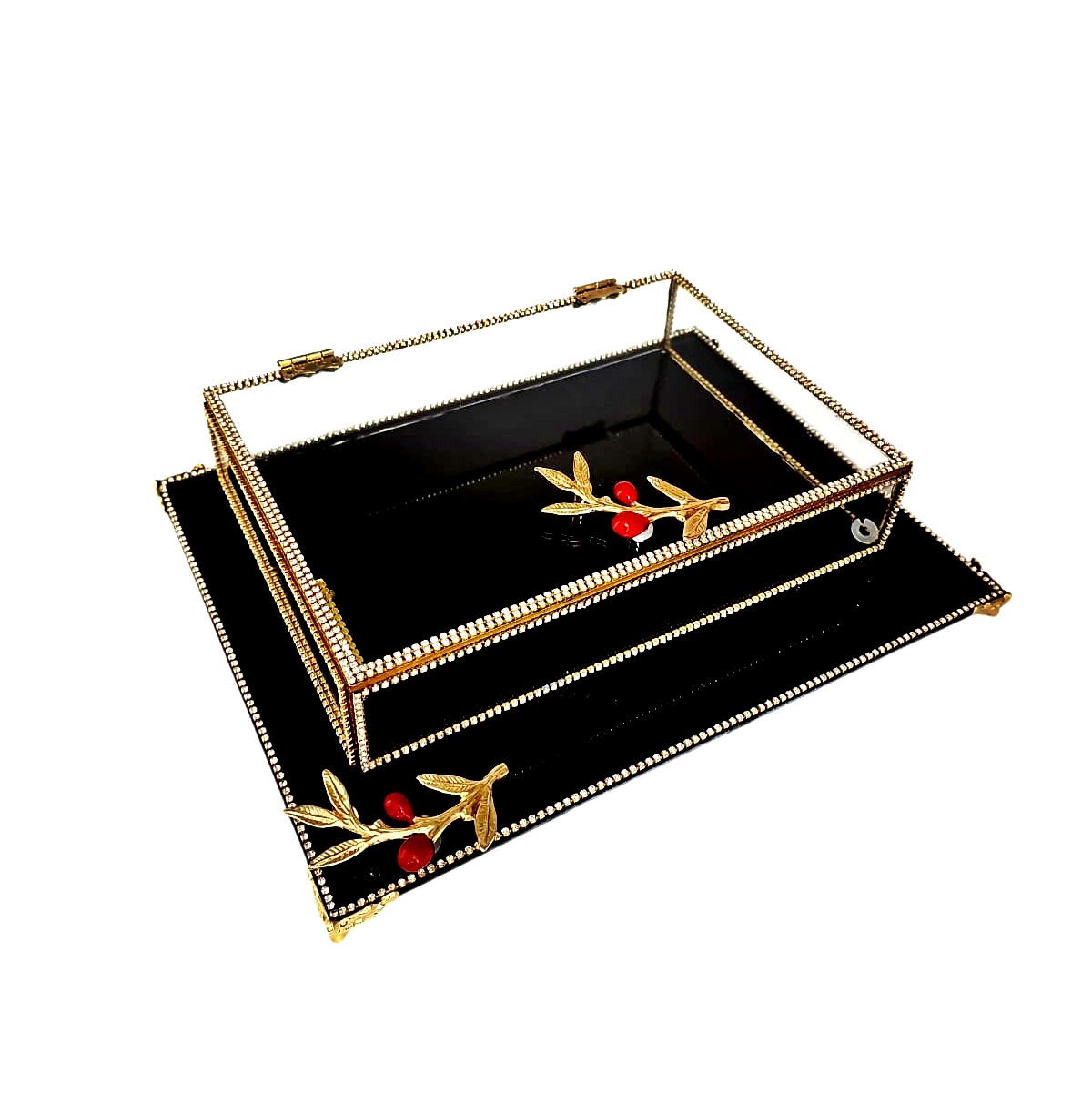KDD SİYAH CAM, MİNE ÇALIŞMASI , KIRMIZI ZEYTİN DALI , DİKDÖRTGEN AYAKLI SUNUMLUK+CAM KUTU – 6096